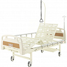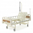 Кровать - 4-х секционная с винтовым (механическим) приводом регулировки угла наклона спинной и ножной секций. Основание кровати выполнено из стали, покрыто ударопрочной эпоксидной эмалью. Съемные спинки головы и ног с противоударными бамперами выполнены из ABS-пластика. Выдвижной регулятор положения ложа расположен в ножной части кровати, что позволяет персоналу легко регулировать положение ложа. Боковые ограждения (2шт) выполнены из алюминия и легко опускаются, обеспечивая быстрый доступ к пациенту. Несущие колеса кровати изготовлены из высокопрочной стали и закрыты декоративными колпаками, придающими кровати современный внешний вид.